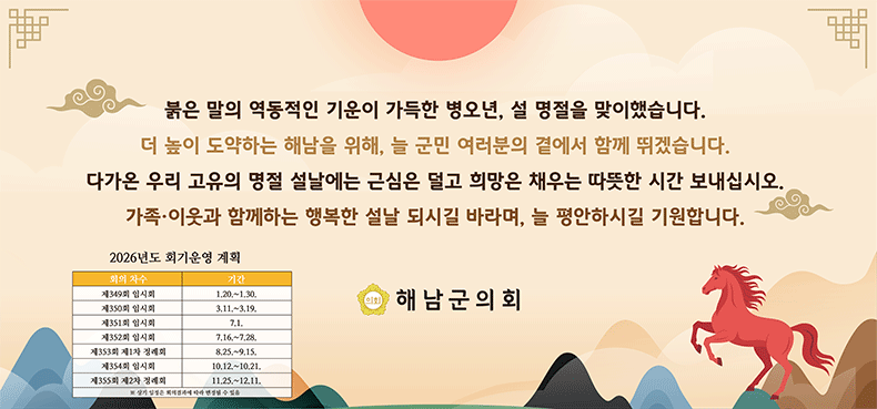5분 자유발언 존경하는 해남군민 여러분! 그리고 ‘농어촌 수도 해남’을 만들기 위해 밤낮없이 애쓰고 계신 명현관 군수님을 비롯한 공직자 여러분! 황산·문내·화원면을 지역구로 두고 의정활동을 하고 있는 해남군의회 의장 이성옥 의원입니다. 쌀 소비 감소와 농업 환경 변화라는 쉽지 않은 여건 속에서도, 현장에...