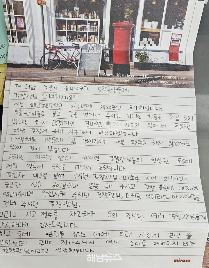 ![]() 편지 / 사진제공=해남경찰서 |