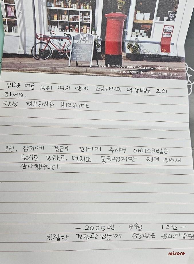 The student was deeply moved by the officers’ swift response in handling the scene and apprehending the suspect when the student’s parents were recently involved in a hit-and-run accident. To show appreciation for their dedication, Yoon carefully wrote and delivered the letter.