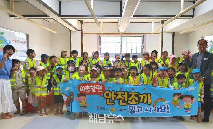해남군이 아이들의 안전한 야외활동을 지원하기 위해 관내 모든 어린이집과 유치원에 어린이 안전조끼 1,020벌을 배부했다.