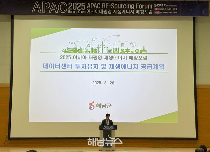 해남군은 26일 부산에서 열린 「2025 아시아태평양 재생에너지 매칭포럼」에 참석해 ‘솔라시도 데이터센터 투자유치 및 재생에너지 공급계획’을 발표했다.