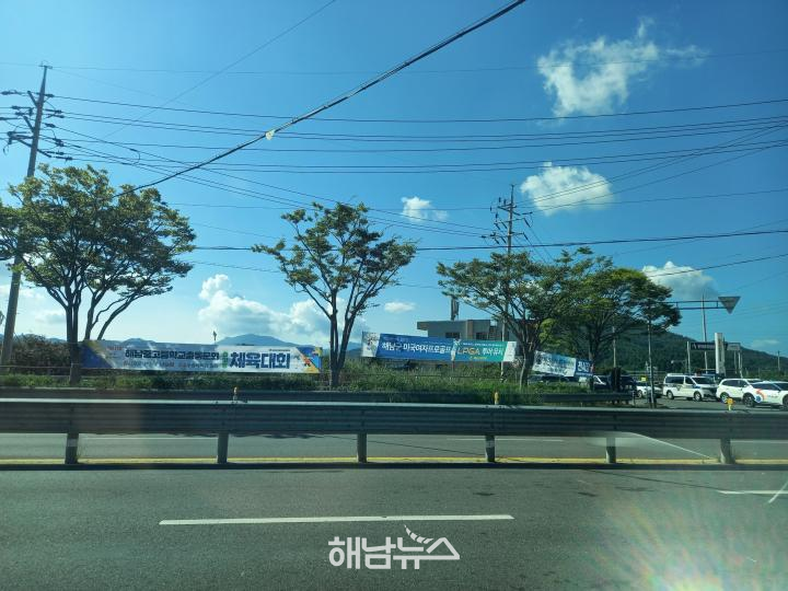 현수막 거치대가 있는데도, 규정 따위는 안중에도 없고, 제멋대로 걸어 놓고는 사람들 눈살 찌푸리게 하고…