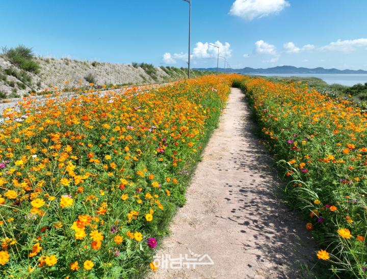 진도군 나리방조제(3.2km) 일대가 다채로운 가을꽃으로 물들어 지역 명소로 떠오르고 있다.