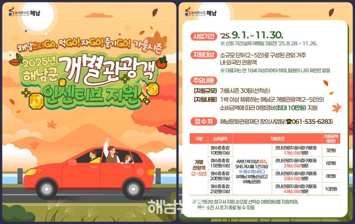 ![]() 개별관광객 인센티브 지원 / 사진제공=해남군 |