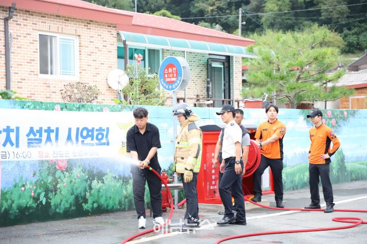 Jindo Fire Station held a demonstration of newly installed emergency fire suppression equipment on September 26 in Soaengmu Village, Jisan-myeon, to strengthen fire response capabilities in vulnerable areas.