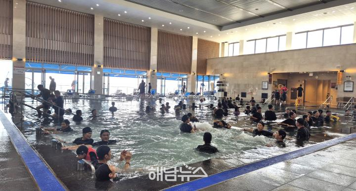 ![]() 추석 연휴, 완도해양치유센터 딸라소풀에 사람들로 붐빈 모습 / 사진제공=완도군 |