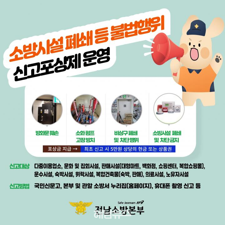 Wando Fire Station (Chief Lee Min-seok) announced on the 13th that it is operating a year-round reward system for reporting illegal acts related to fire safety, such as the blocking of emergency exits or the tampering and damage of fire-fighting facilities, in order to prevent potential casualties in the event of a fire.