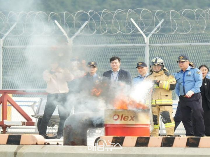 The drill was carried out in the presence of the Wando Coast Guard Chief and related department officials, and included performance evaluations such as spray-power comparison with existing equipment (oil dispersant sprayers and air-foam nozzles), fire-suppression capability tests, and operational safety checks.