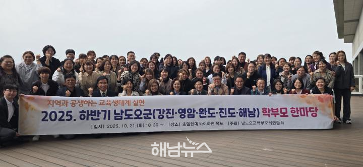 전라남도해남교육지원청(교육장 조연주)은 10월 21일(화) 해남 산이정원과 호텔현대 바이라한 목포에서 강진, 영암, 완도, 진도, 해남 등 5개 교육지원청 교육장과 학부모회 임원 100여 명이 참여한 가운데 「2025 하반기 남도오군 학부모 한마당」을 성공적으로 개최했다고 밝혔다.