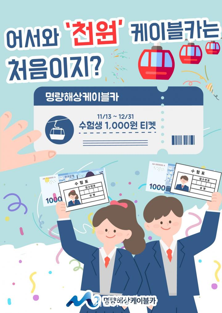 Myeongnyang Marine Cable Car has announced a special “1,000 Won Cable Car” event for students who have completed the 2026 College Scholastic Ability Test (CSAT), running from November 13 through the end of the year.