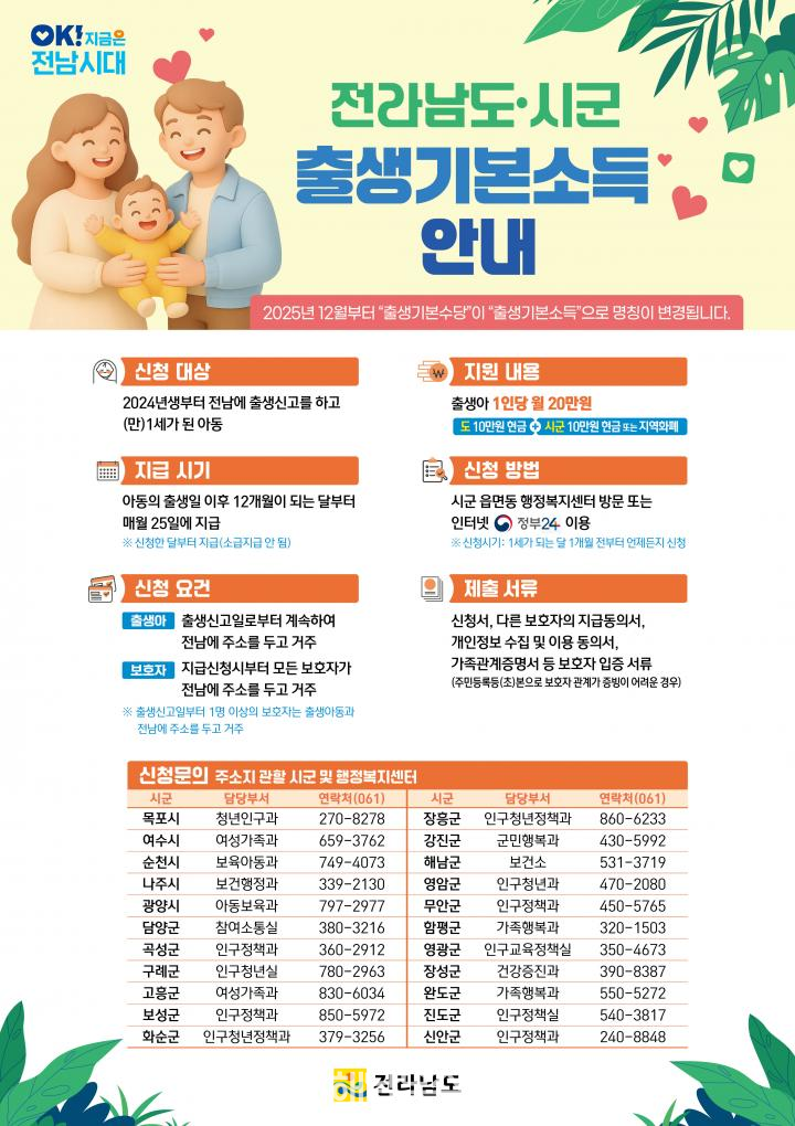 전라남도는 2024년생에 이어 2025년 전남 출생아를 대상으로 ‘전라남도, 시군 출생기본소득’을 지급한다고 밝혔다.