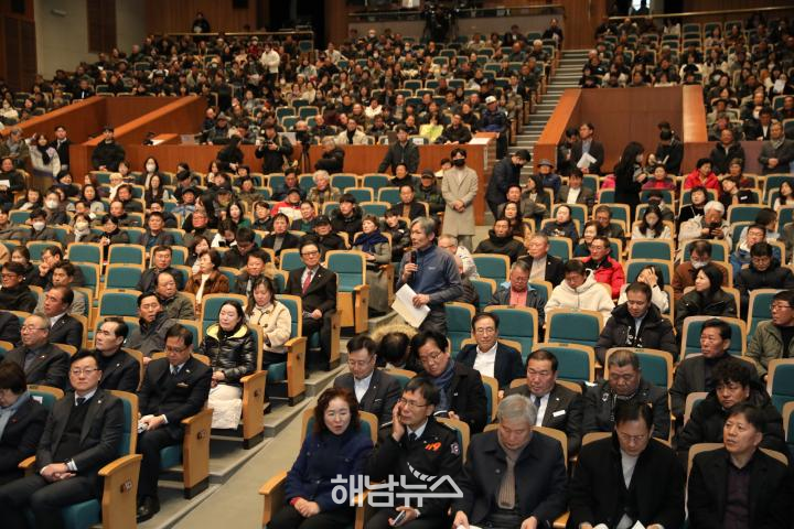 The Haenam town hall is drawing particular attention as it marks the first official follow-up dialogue since the Jeonnam–Gwangju Administrative Integration Public Hearing held in Haenam last year.