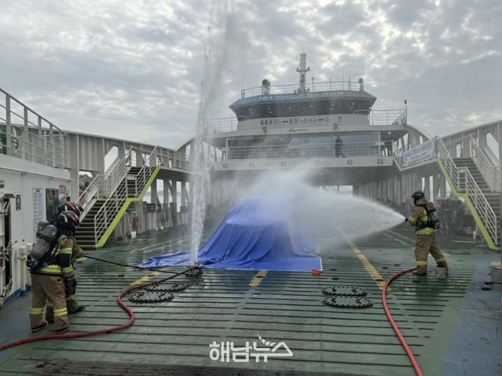 훈련은 소안항을 출항해 화흥포항으로 항해 중이던 차도선 ‘민국호’(811톤) 차량갑판에서 전기차 1대에 원인 미상의 화재가 발생한 상황을 가정해 진행됐다.