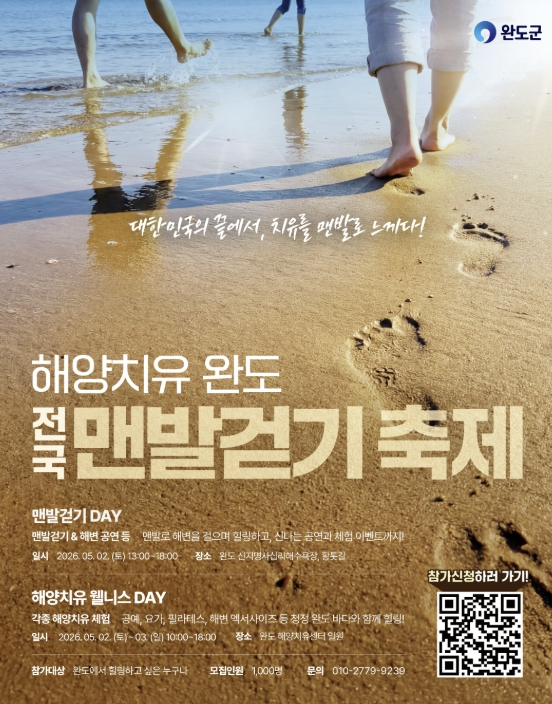 군 관계자는 “올해는 지난해보다 더 다양한 체험 프로그램을 준비했다”면서 “맨발 걷기 축제를 정례화하여 완도를 대표하는 해양치유 관광 콘텐츠로 발전시켜 나가겠다”라고 말했다.