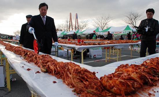 ▲ 지난 11일 해남군 문내면 우수영 울돌목에서 열린 2010땅끝해남 김장축제에서 박철환 해남 군수가 기록계로 413m의 김장김치를 측정하고 있다. © 해남방송월동배추 주산지인 해남군이 명량대첩 413주년을 기념해 열린 '2010 땅끝해남 김장축제'에서 길이 413m 김장김치 담그기 기네스기록에 도전해 성공했다. 지난 11일 충무공 이순신 장군의 명량해전의 승전 현장인 우수영 울돌목에서 2000여명의 주민과 관광객이 함께 참여해 413m 길이의 김치 담그기에 도전해 기네스 기록을 세웠다.해남산 절임배추 4200여 포기와 양념 2톤이 사용된 이날 세계 최장 김치 만들기 도전은 한국 기록원에 의해 공식 인정돼 세계 기네스 북에 등재된다. 이날 담근 김치는 어려운 이웃에게 전달됐으며, 최근 북한의 포격으로 고통을 겪고 있는 연평도 주민들에게 전달됐다. 김장 관련 기네스 기록은 참가자 수와 배추 포기 기록은 있으나 길이는 아직 기록이 없는 것으로 알려졌다. 군은 내년에는 해남 땅끝에서 해남 배추의 우수성을 알리는 2012m 김장 담그기 행사를 열 계획이다./해남방송http://jbnews.net*해남방송 8개 계열 자회사=SBC-tv 서남방송(http://snnews.co.kr),브레이크뉴스 광주.전남<주간>신안신문(주간), 영암뉴스(http://yanews.co.kr), 인터넷신안신문(http://sanews.co.kr), 브레이크뉴스 광주.전남<주간>, 호남뉴스라인(http://www.hnnewsline.kr/),해남방송http://jbnews.net/제휴협력사-브레이크뉴스 광주전남(http://honam.breaknews.com/)
