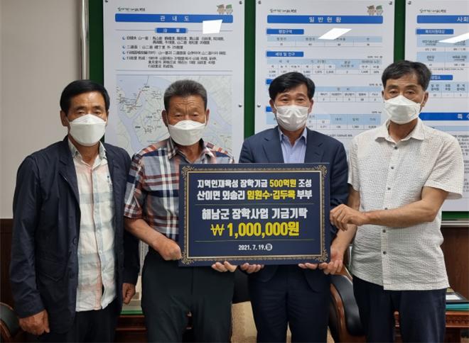 산이면 외송리 임훤수·김두옥 부부는 19일 해남군 장학사업기금으로 100만 원을 기탁했다.