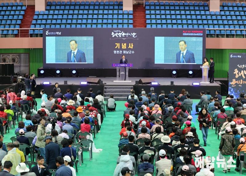 명현관 군수는 기념사를 통해“전국최초 농민수당 지급을 시작으로,해남최대 국책기관인 국립농식품기후변화대응센터 유치까지 해남이 걸어온 길이 바로 대한민국 농어업·농어촌의 새로운 역사가 되어왔다”며“이러한 자긍심을 바탕으로 이제‘대한민국 농어촌수도 해남’의 비전으로 나아가고자 한다”고 천명했다.