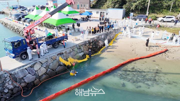 완도해양경찰서(서장 김길규)는 24일 해남군 송지면 송호리 방파제 일원에서 해남군과 함께 ‘2025 해안방제 합동훈련’을 실시했다고 밝혔다.