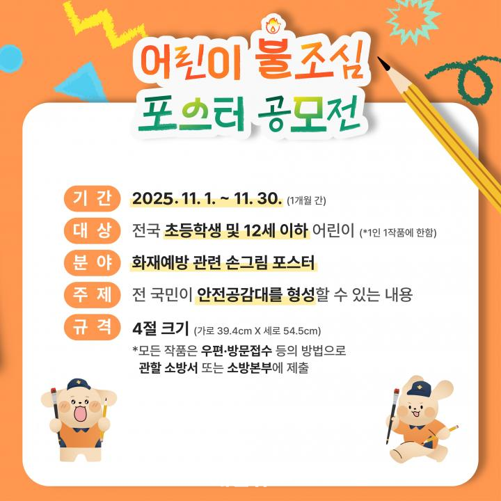 The Haenam Fire Station (Chief Park Chun-cheon) is holding a Fire Safety Poster Contest for local elementary school students and children aged 12 and under, in recognition of November as Fire Prevention Month. The contest is open until November 21.