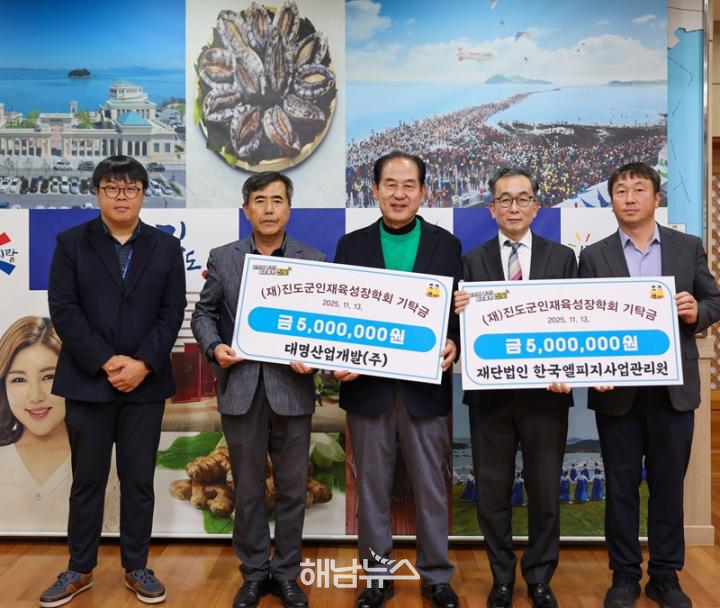 진도군은 13일 개최된 기탁식에서 재단법인 한국LPG사업관리원(원장 손승진) 500만 원, ㈜대명산업개발(대표 정동진) 500만 원 등 총 1,000만 원의 인재육성장학금을 전달받았다고 밝혔다.