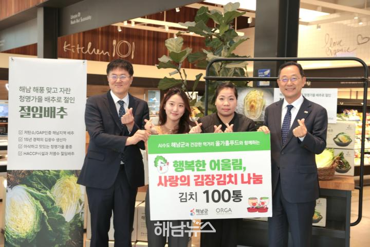 The ceremony was attended by Mayor Myeong Hyun-kwan, ORGA Whole Foods CEO Kwon Soon-wook, and Haenam kimchi cabbage producers.