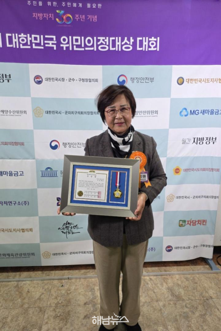 해남군의회 민경매 의원이 지방자치 30주년을 맞아 지난 11월 28일 국회도서관에서 개최된 『제5회 대한민국 위민의정대상 대회』에서 우수상과 함께 국회 문화체육관광위원장상을 수상하는 영예를 안았다.