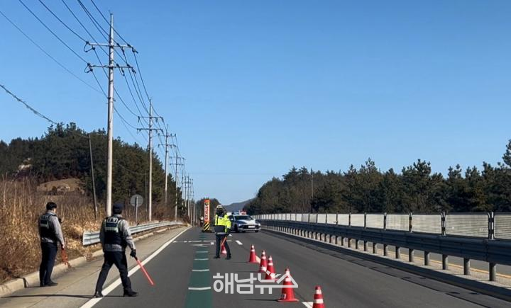 The Haenam Police Station conducted an FTX (Field Training Exercise) aimed at preventing secondary accidents at traffic crash scenes at around 2:00 p.m. on January 27 in the Ilsin-ri area of Hwangsan-myeon, Haenam County.