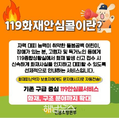해남소방서(서장 박춘천)가 화재 및 응급상황 발생 시 보다 신속하고 정확한 현장 대응을 위해 ‘119화재안심콜서비스’ 활성화에 나섰다.