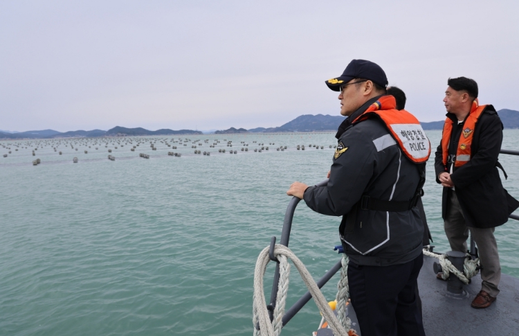 ![]() 관내 김 양식장을 점검하는 완도해양경찰서장의 모습 |