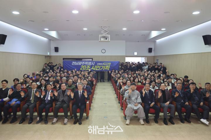 민 의원은 13일 목포 김대중노벨평화상기념관 다목적강당에서 열린 ‘20조 시민기획 경청투어’에서 시민들과 함께 전남·광주 통합특별시 출범 시 정부가 지원 예정인 20조 원 재정의 활용 방향과 지역 산업 전략에 대한 의견을 청취했다.