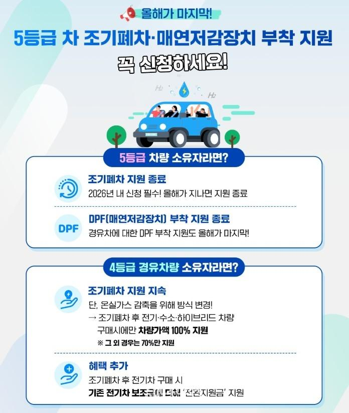 특히 5등급 차량에 대한 조기 폐차와 매연 저감장치 지원사업이 올해를 끝으로 종료될 예정인 만큼, 대상 차량 소유자들의 적극적인 참여가 요구된다.