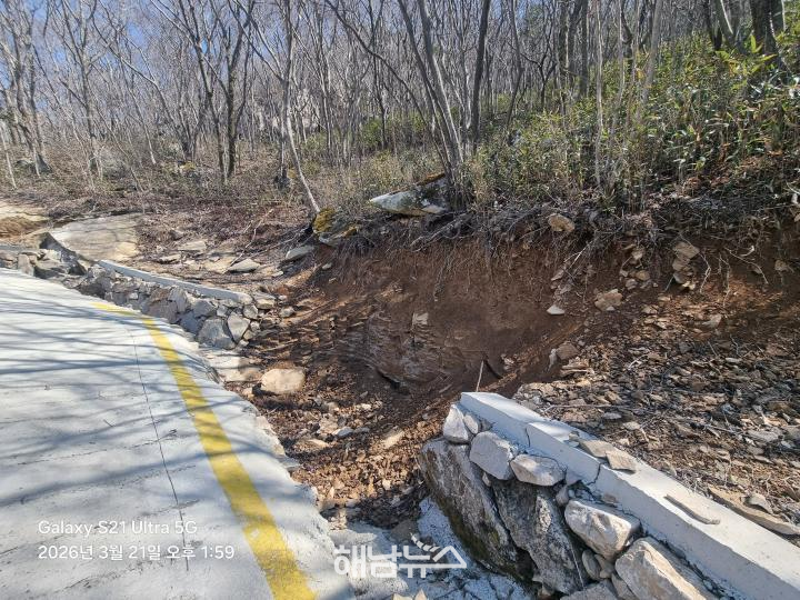 ![]() 만일암지 가는 길 옹벽 붕괴 /사진제공=해남뉴스 |